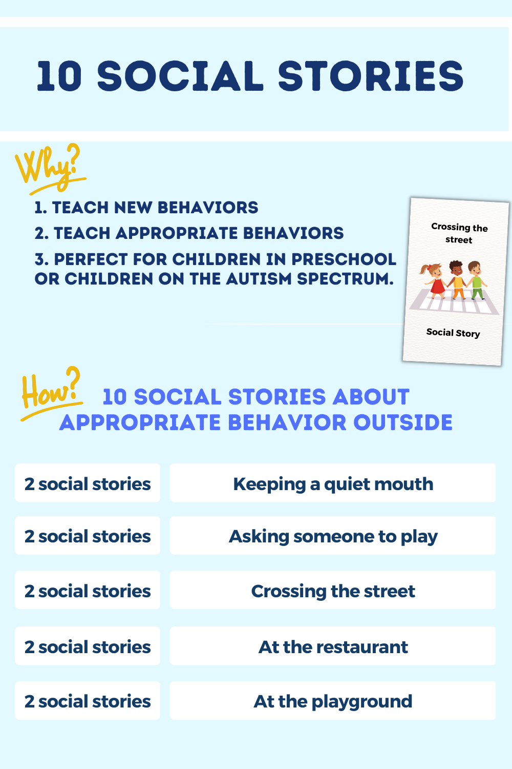 Social stories can be used to teach your child specific social skills, such as how to make eye contact or how to start a conversation.
